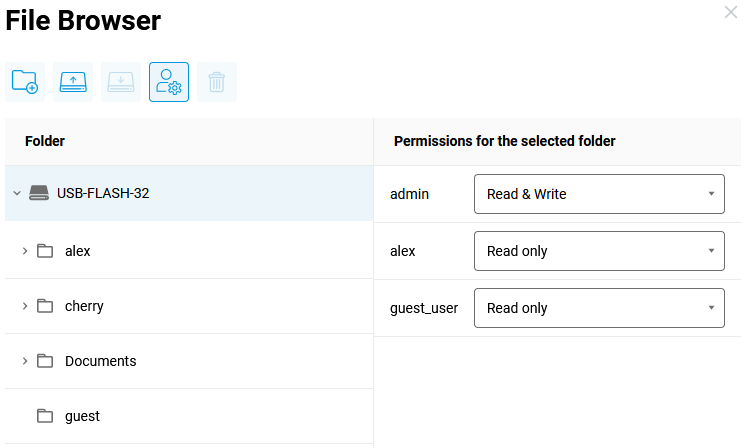 To allow users to find the folder they have access to, you need to set the parent directories to read-only. In our example, the parent directory is the USB drive itself, since the user folders are in the root directory, so alex and guest_user users have set read-only permissions.