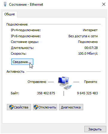 В окне "Состояние" нажмите кнопку "Сведения" для получения подробной информации о подключении.